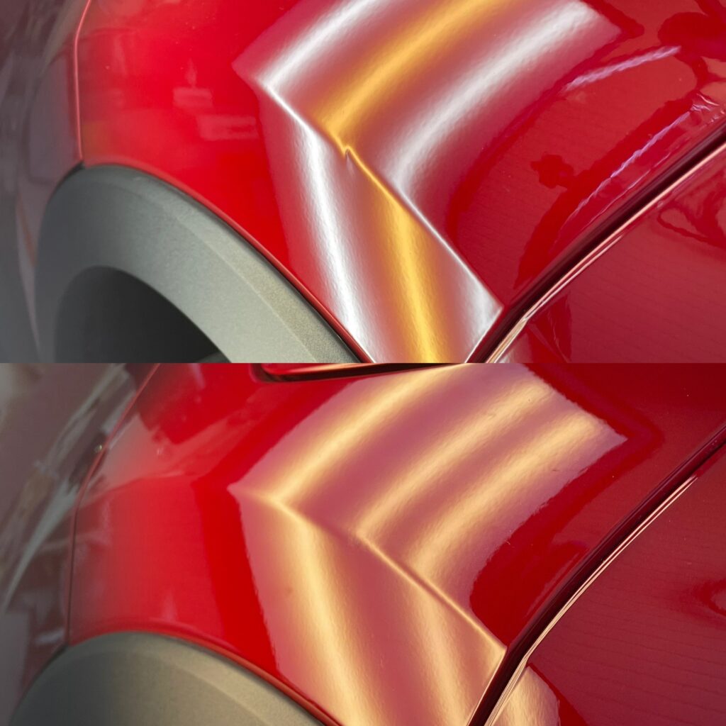 傷だけは残ってしまいますが、プレスラインの上にあった凹みが無くなるだけでグッと印象は良くなるのが分かっていただけると思います。