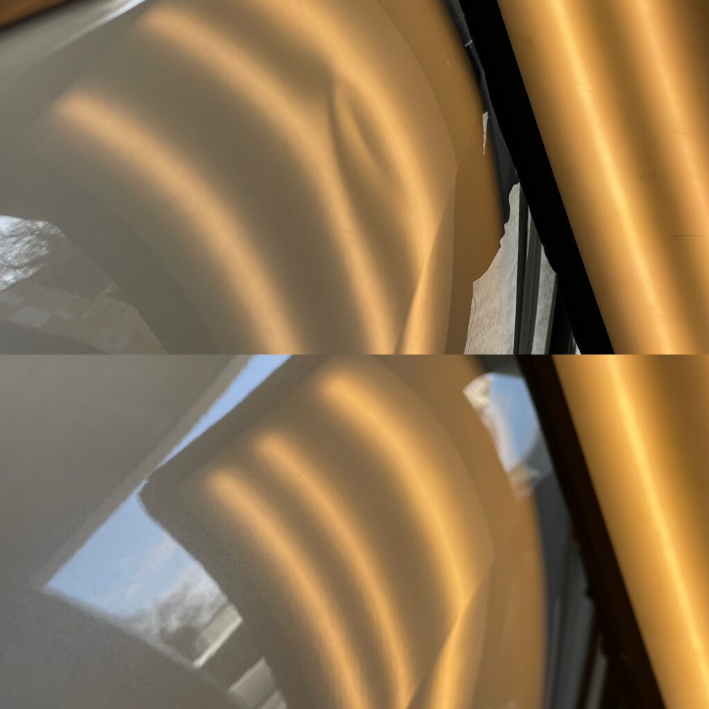腫れて高くなっている部分はきちんと落として、凹みの裏側はドア内部の補強がある部分だったため内張りを取り外して隙間から工具を入れて凹みを押し上げてデントリペアいたしました。