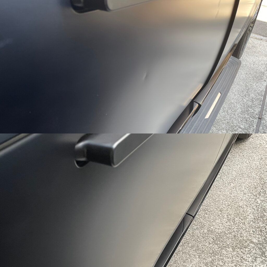かと言って弱い力で押しててもレンジローバーはアルミボディでなかなか硬く、凹みが戻ってしまいます。
